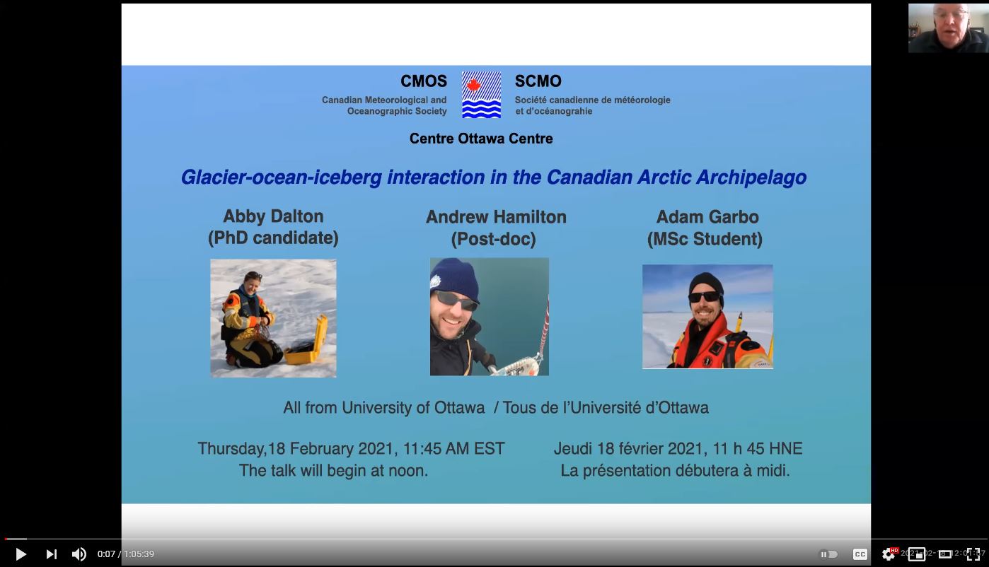 PhD student Abby Dalton, post-doc Andrew Hamilton and MSc student Adam Garbo gave a talk about their work on ‘Glacier-Ocean-Iceberg interaction in the Canadian Arctic Archipelago’ to the Ottawa Centre of the Canadian Meteorological and Oceanographic Society on Feb. 18, 2021. Click on the image to see the talk on YouTube (Length=1h:05min), or go to https://www.youtube.com/watch?v=W6uyDuOJx_o